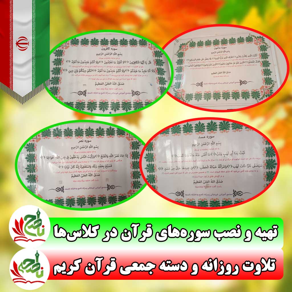 سوره های قرآنی در همه کلاس ها نصب شده اند و هر هفته به صورت چرخشی تغییر می یابند. دانش آموزان طی هفته در اول صبح به صورت دسته جمعی این سوره ها را روخوانی می کنند تا در پایان هفته این سوره ها را حفظ نمایند.